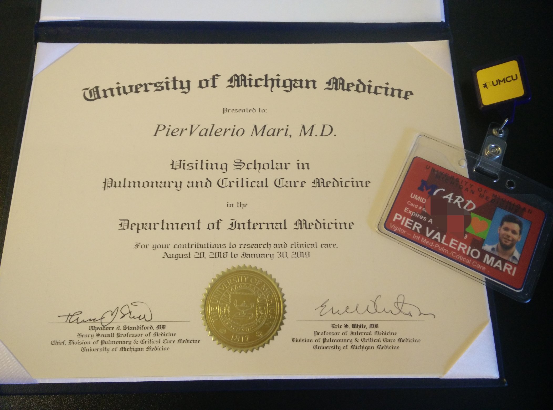 - Visiting Scholar presso University of Michigan (2018-2019 presso Ann Arbor, MI, USA) con progetto di ricerca focalizzato sulla Fibrosi Polmonare Idiopatica (IPF);